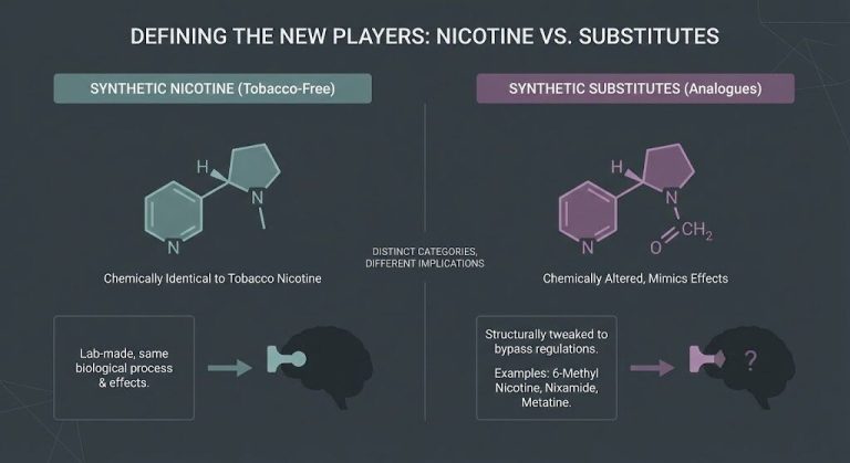 Synthetic Nicotine Substitutes (Analogues) are different. These are compounds that are structurally similar to nicotine but have been tweaked at a molecular level. The goal for manufacturers is often to create a chemical that hits the same brain receptors (giving you that familiar “throat hit” and satisfaction). Still, it is technically distinct enough to bypass specific tobacco regulations.